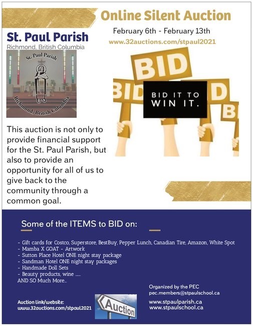 During Covid-19, our Bingo evenings have been suspended, and with it, the opportunity to financially support the parish and to socialize and connect with our family and friends in the community. The purpose of this auction is not only to provide financial support for the St. Paul Parish, but also to provide an opportunity for all of us to give back to the community through a common goal.