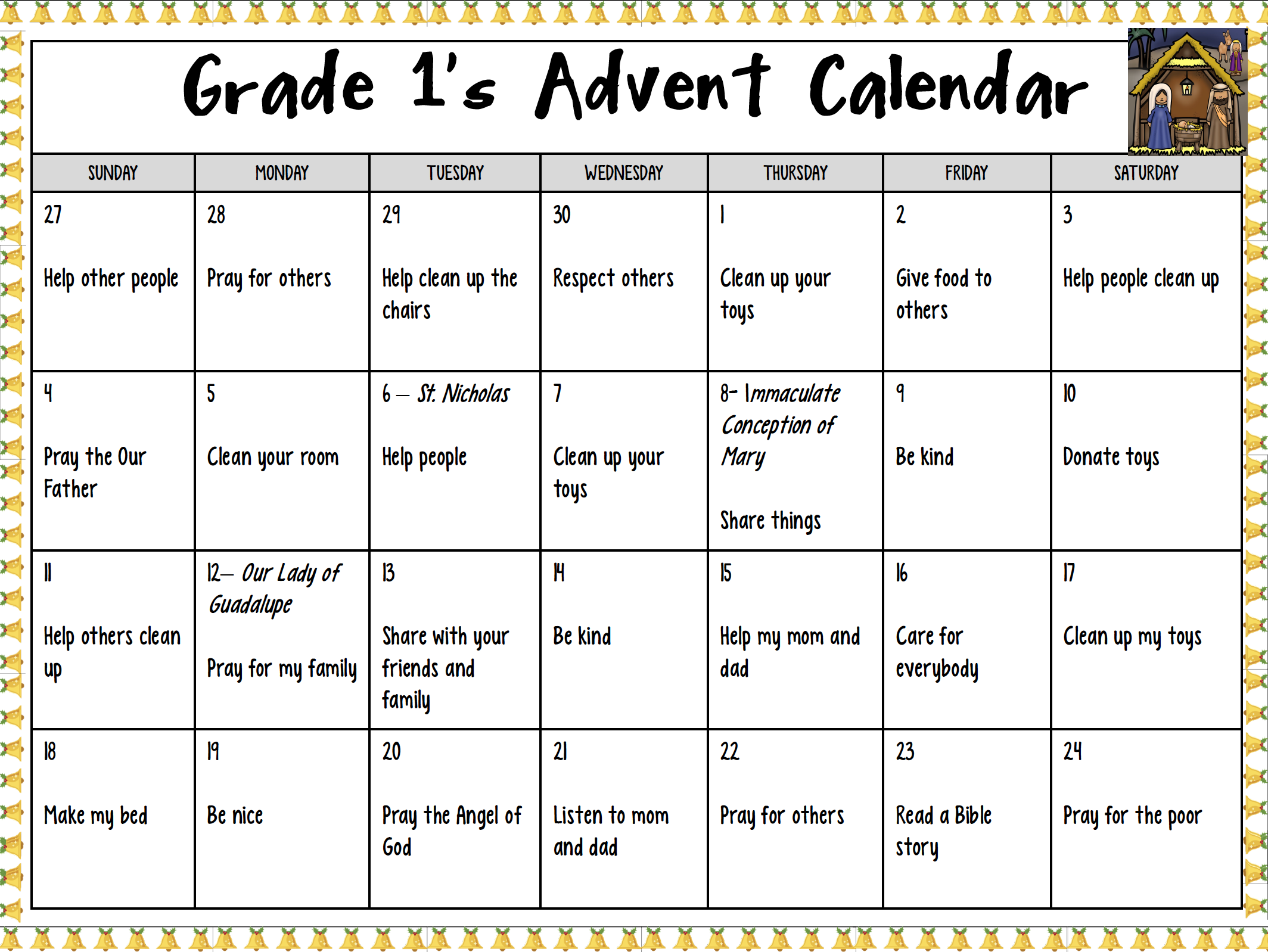 The Grade 1’s reflected different ways they can prepare their hearts for Jesus during the season of Advent. They thought of prayer activities, acts of kindness and small sacrifices they can make to become closer to Jesus. In our classroom, we have a life-size version of the calendar and we will read it each day and do our best to follow it. Some of them can’t be done at school, so we have attached a copy of the Advent calendar to this blog. A paper copy will also be sent home this week. We are excited to be journeying with your children throughout the Advent.