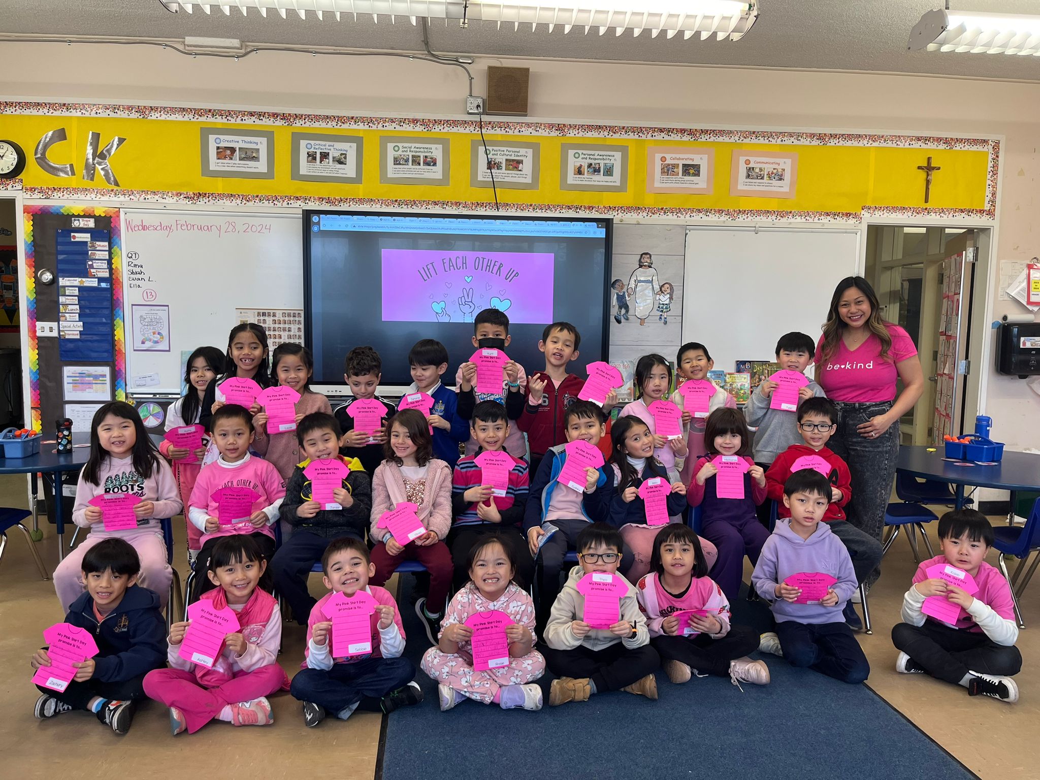 On Wednesday, the children celebrated Pink Shirt Day. In Grade 1, we focused on kindness in our classroom. We read stories that helped to reinforce the Pink Shirt Day theme of “Lift Each Other Up.” The children also participated in a virtual broadcast across Canada for Pink Shirt Day. They had a wonderful day, and made their very own Pink Shirt Day Promises, where they thought of ways they could be a kind friend and lift each other up everyday.