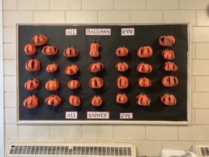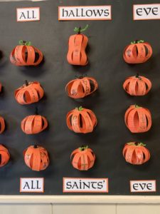 Lastly, if you are in the school, stop by and check out the Grade 7’s “Saint Pumpkins” on the bulletin board next to the south doors of the school. They are meant to remind the students as they walk by that Halloween means “All Saints’ Eve” as the next day is All Saints Day!