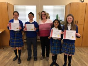 On Tuesday, March 12th, four of our Grade 7’s (Lorenzo Lachica, Chloe Jeffrey, Arielle Rodricks and Amy Lam) went to the Tri-School Speech Arts Festival at St. Joseph the Worker. All four of them were awarded a Gold level in the persuasive speech category! Well done!