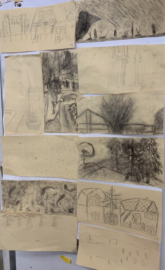 In preparation for our “visit” the students engaged in landscape sketches in the field (outside) inspired by Sun Xun’s often painting his pieces outside. These were just brief sketches of various school landscapes both up close and distanced perspectives.