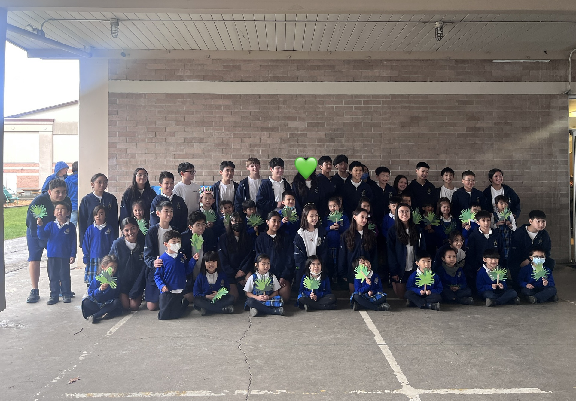 In preparation for Palm Sunday and the beginning of Holy Week, here we are with our buddies and the palm leaves we made using our (hand) palms!