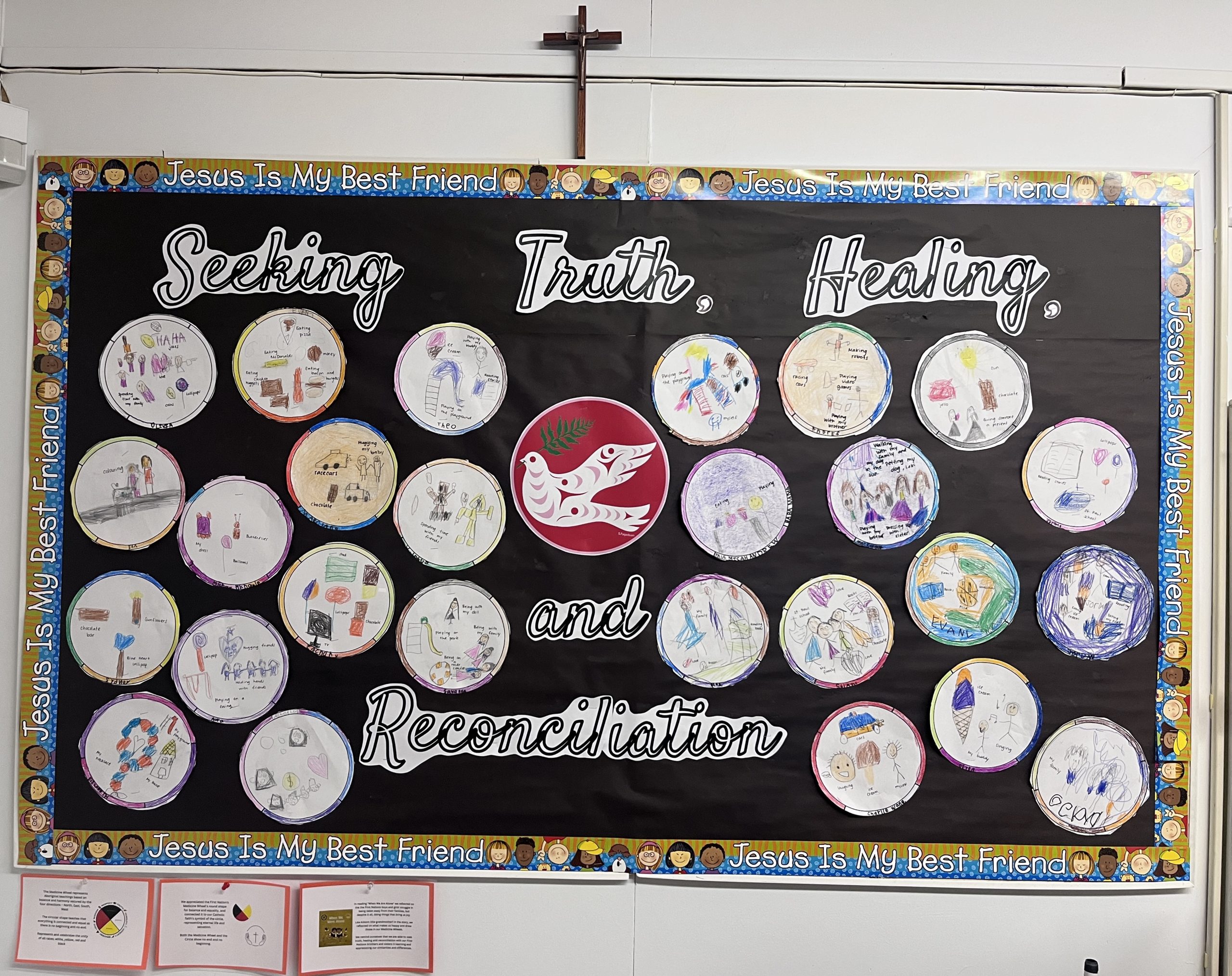 We appreciated the First Nation’s Medicine Wheel’s round shape for balance and equality, and connected it to our Catholic faith’s symbol of the circle, representing eternal life and salvation. Both the Medicine Wheel and the Circle show no end and no beginning. We remind ourselves that we are able to seek truth, healing and reconciliation with our First Nations brothers and sisters in learning and appreciating our similarities and differences.