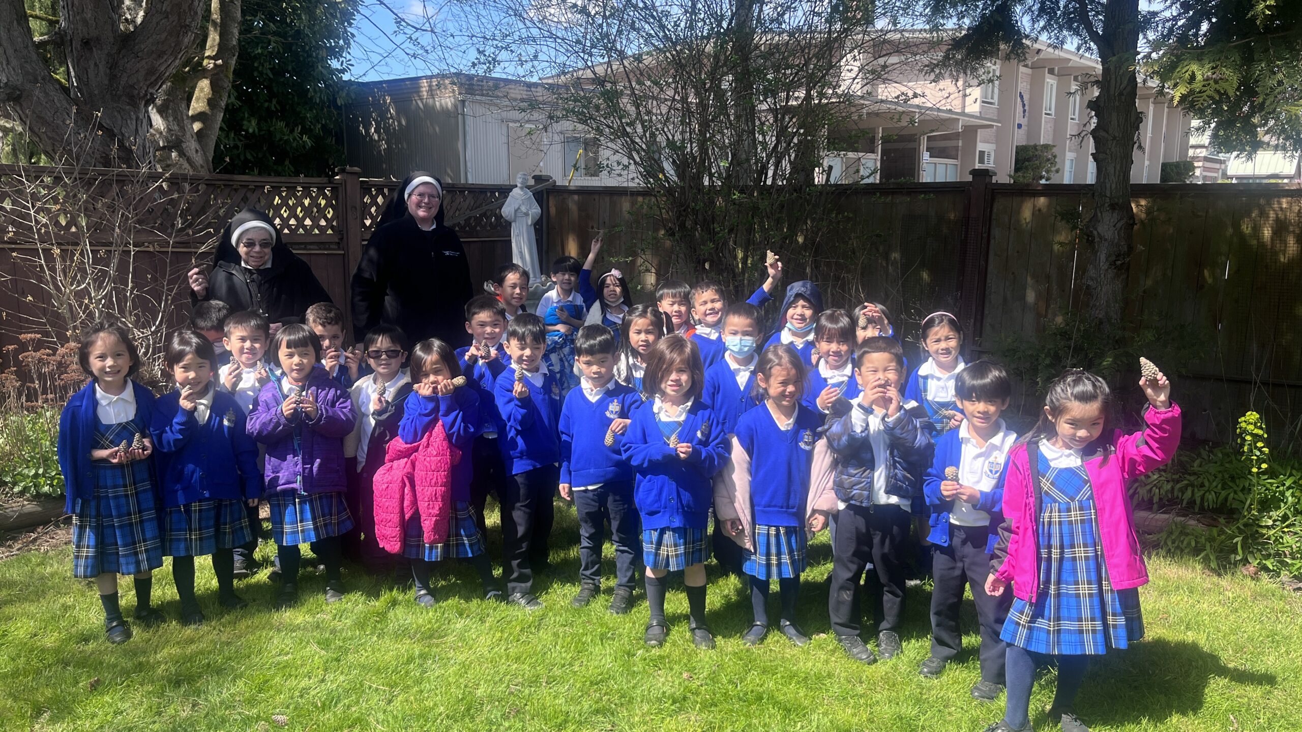 Here we are from last week’s Nature Walk! We visited Sister Maureen & Sister Christine at the St. Paul Convent. They showed us their beautiful backyard with a statue of St. Francis; as our Sisters are of the Franciscan Order. We have posted more pictures and videos on ClassDojo!